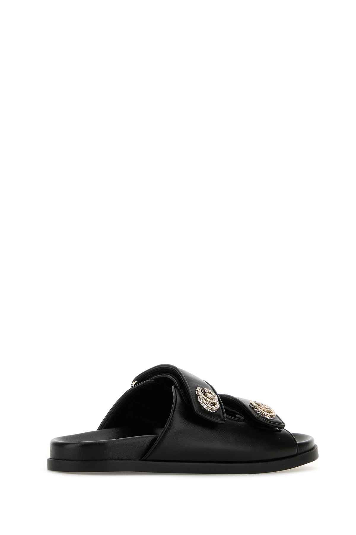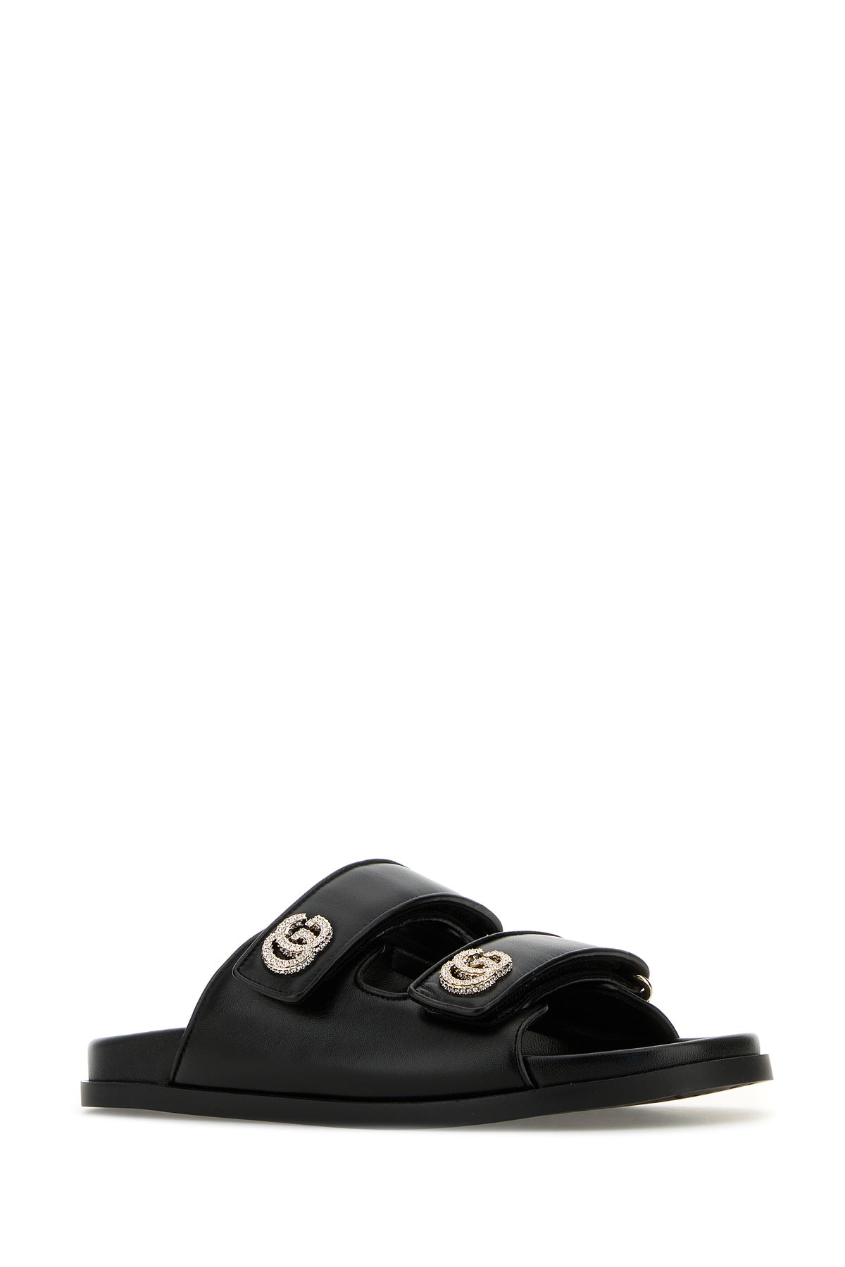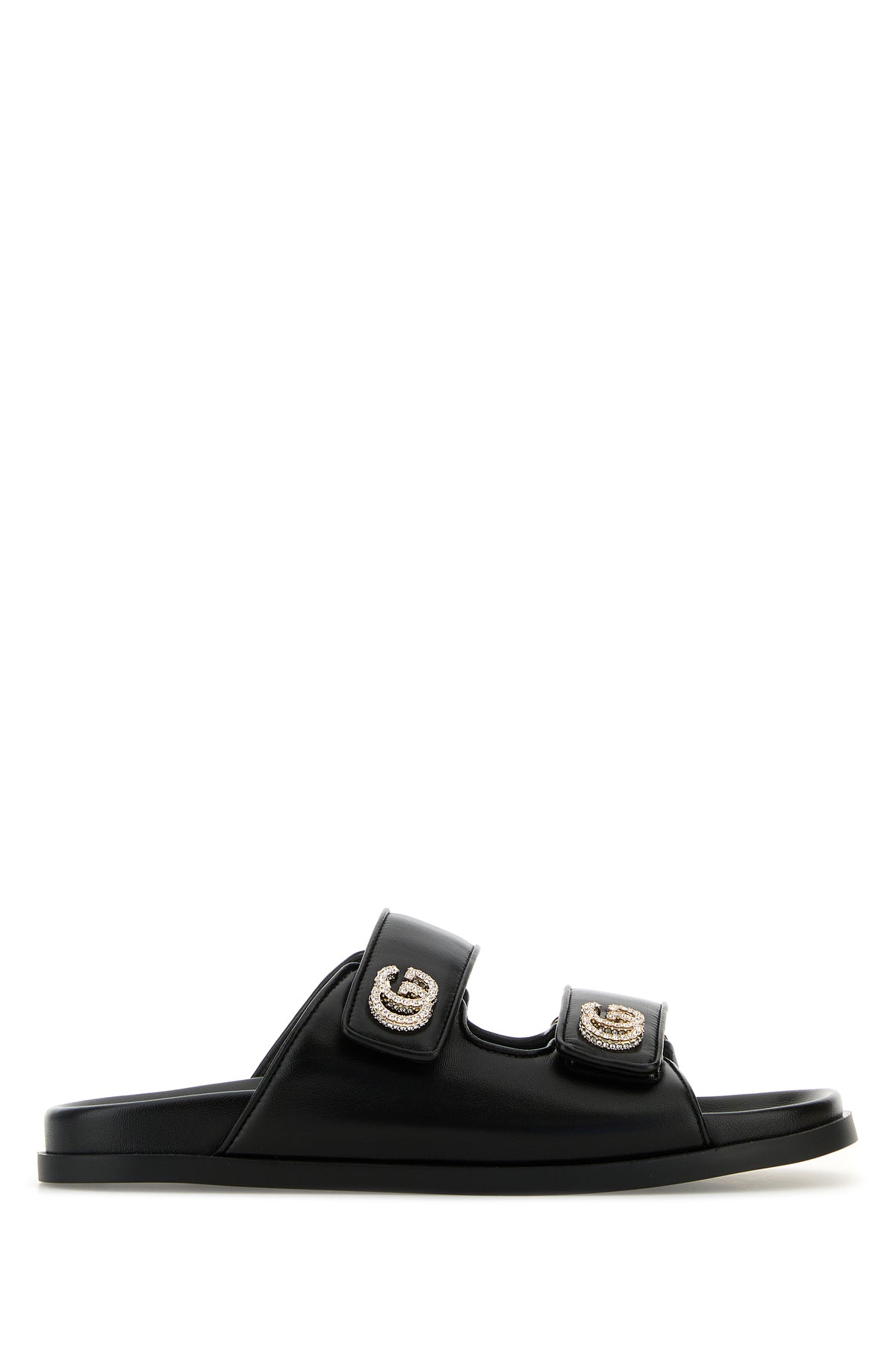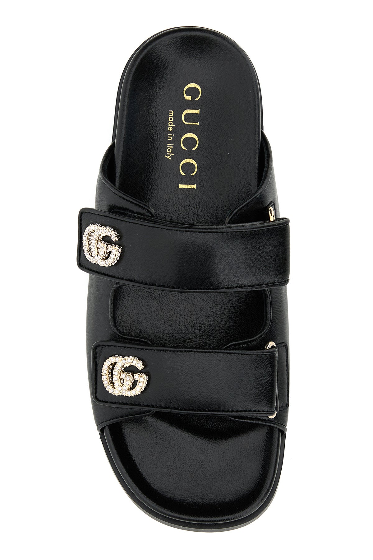 Slippers realizzate in pelle liscia arricchite da dettaglio metallico GG con cristalli sul collo del piede.