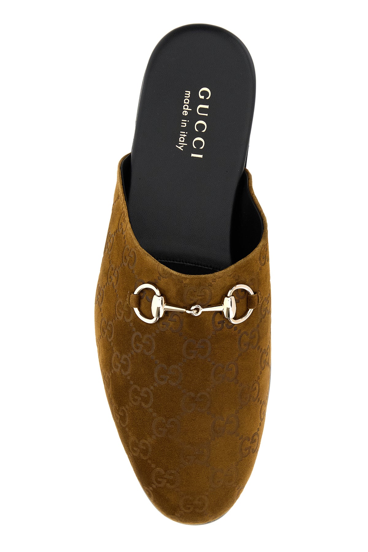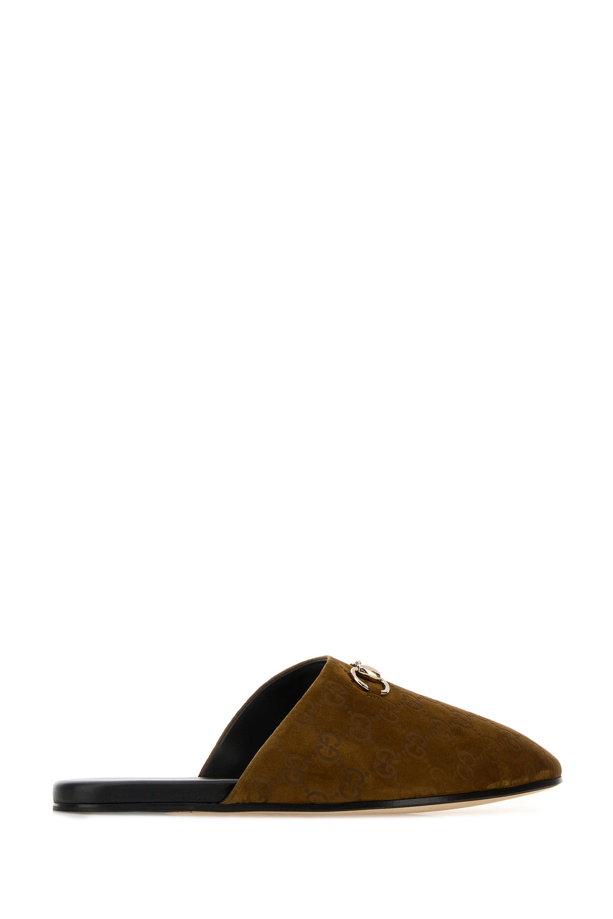Slippers realizzate in pelle scamosciata caratterizzate da motivo GG impresso su tutta la superficie arricchite da dettaglio metallico Morsetto sul collo del piede.
