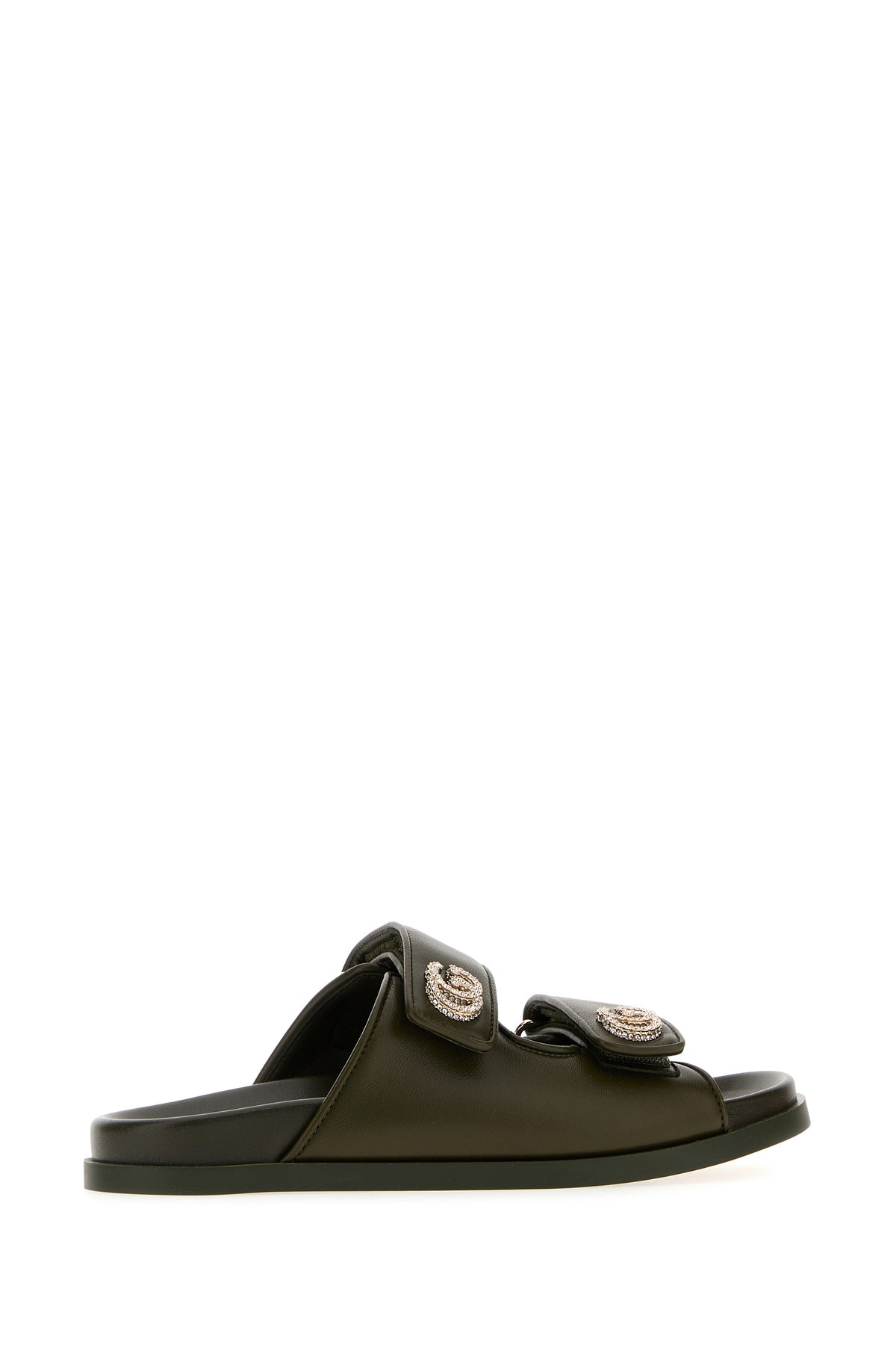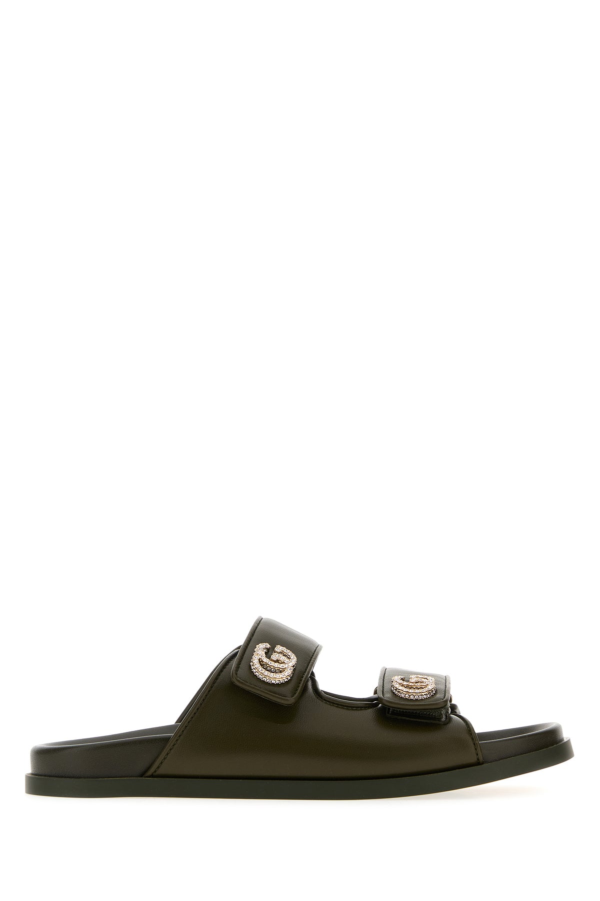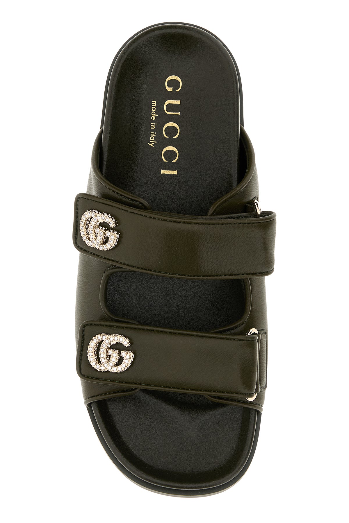 Slippers realizzate in pelle liscia arricchite da dettaglio metallico GG con cristalli sul collo del piede.