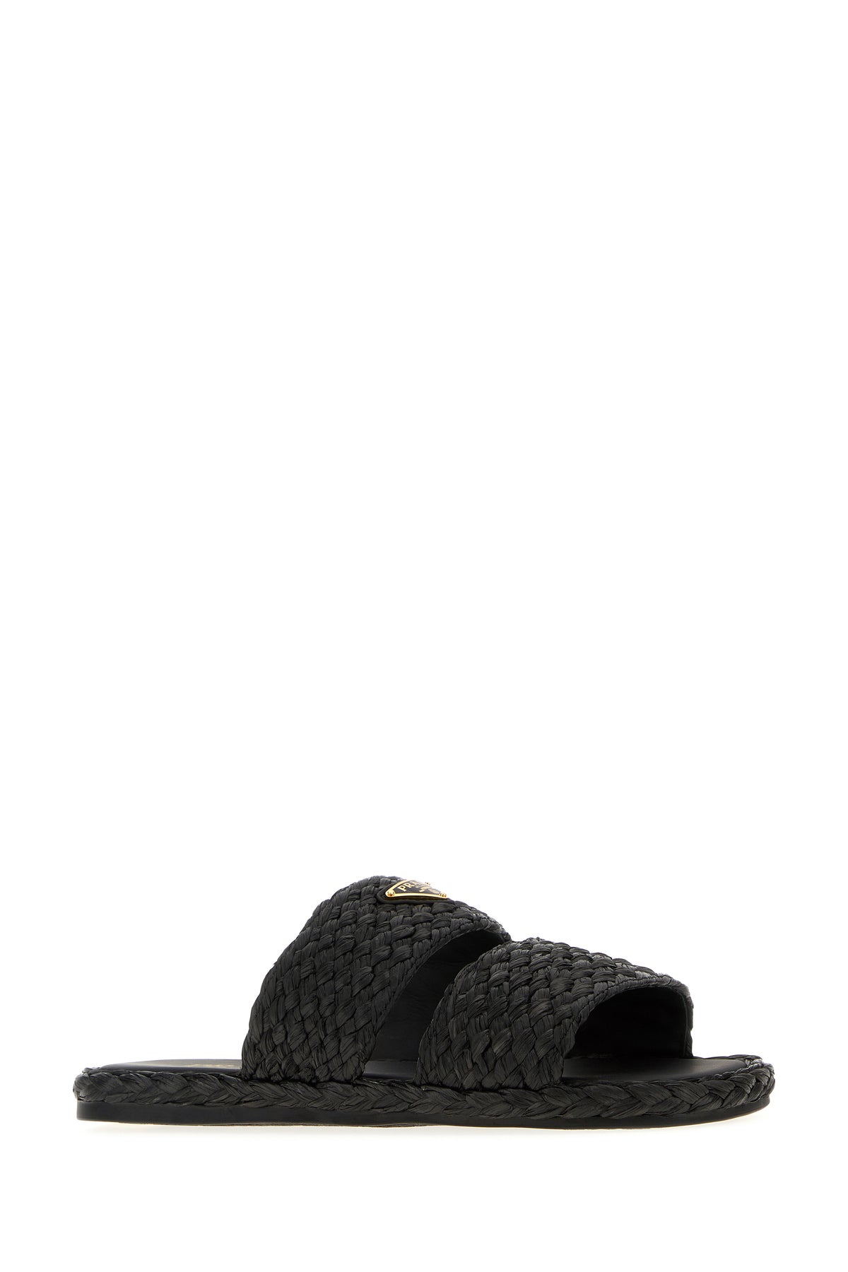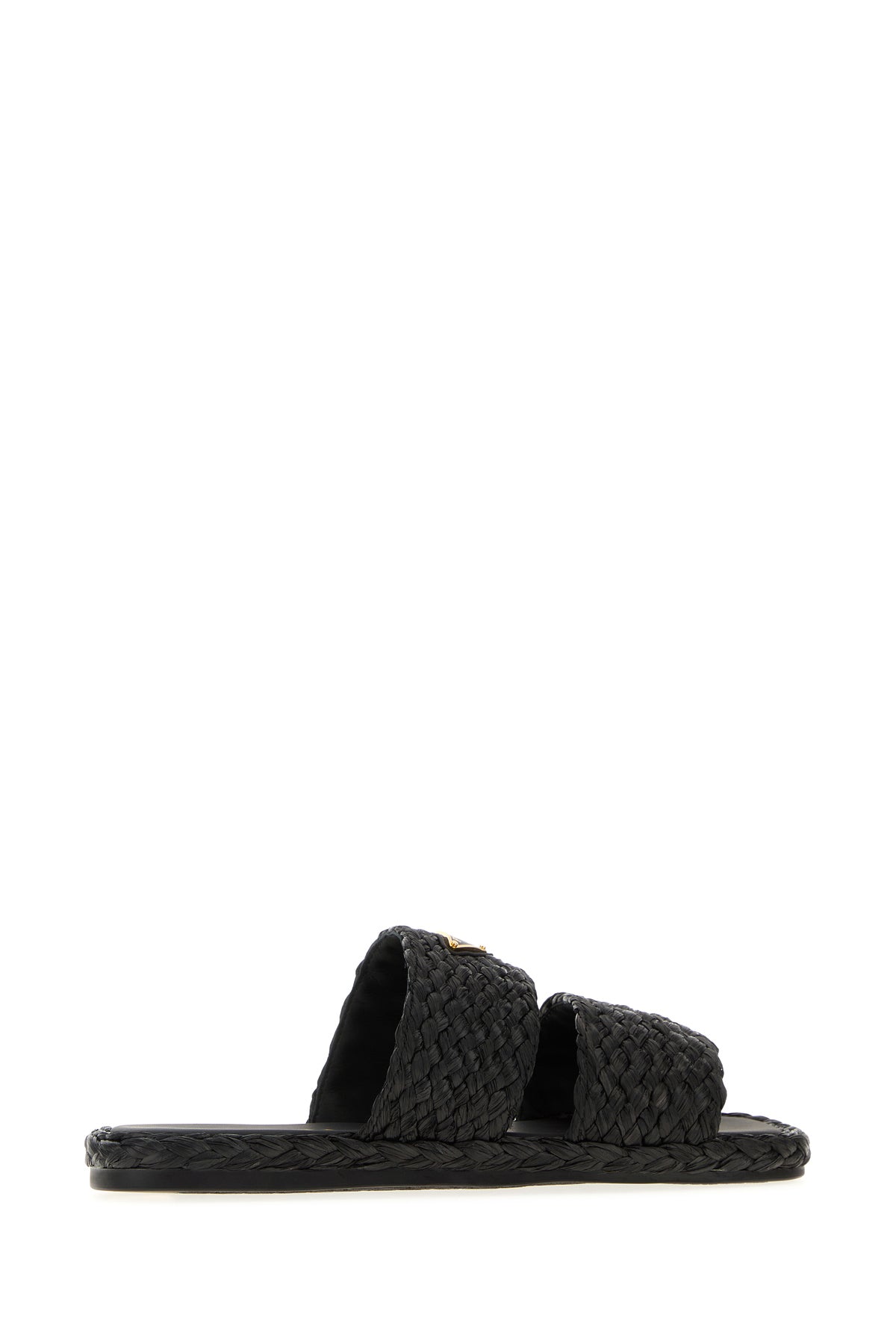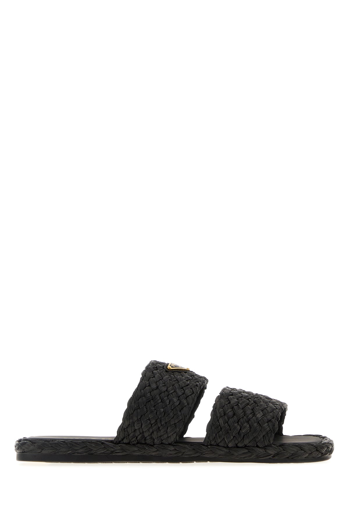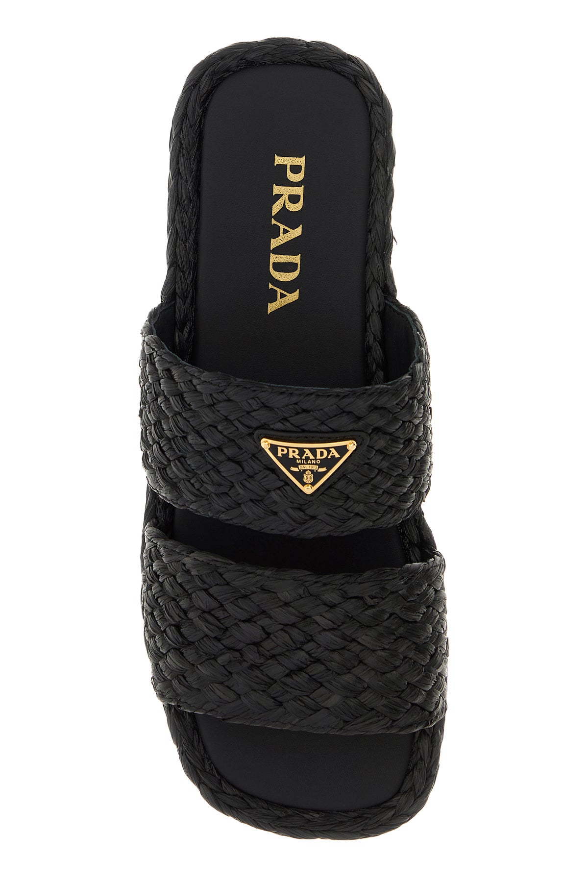 Slippers realizzate in rafia intrecciata arricchite da iconico triangolo logato in metallo sul collo del piede.