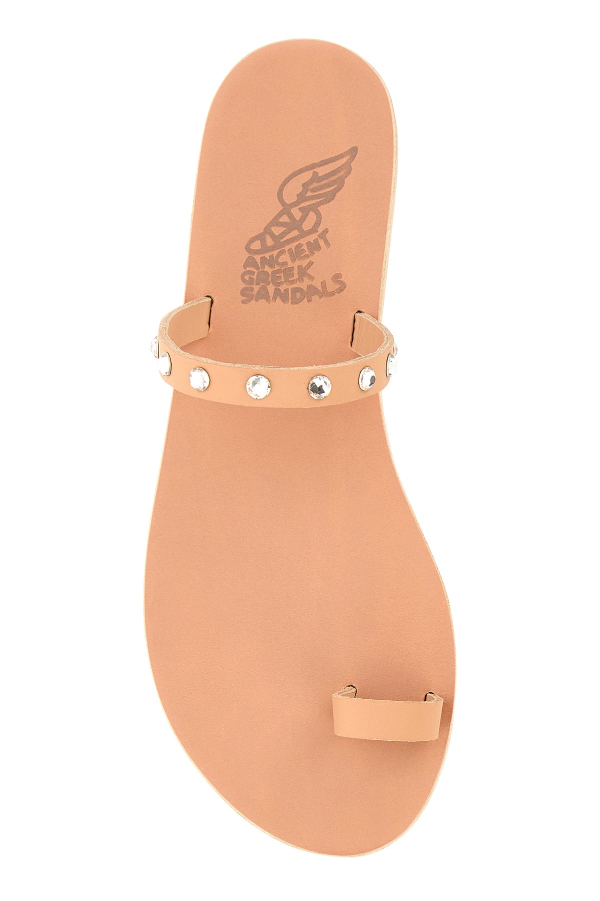 Slippers infradito realizzate in pelle arricchite da cristalli sulla parte frontale.