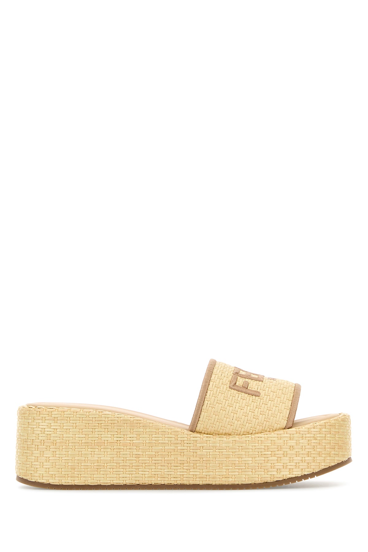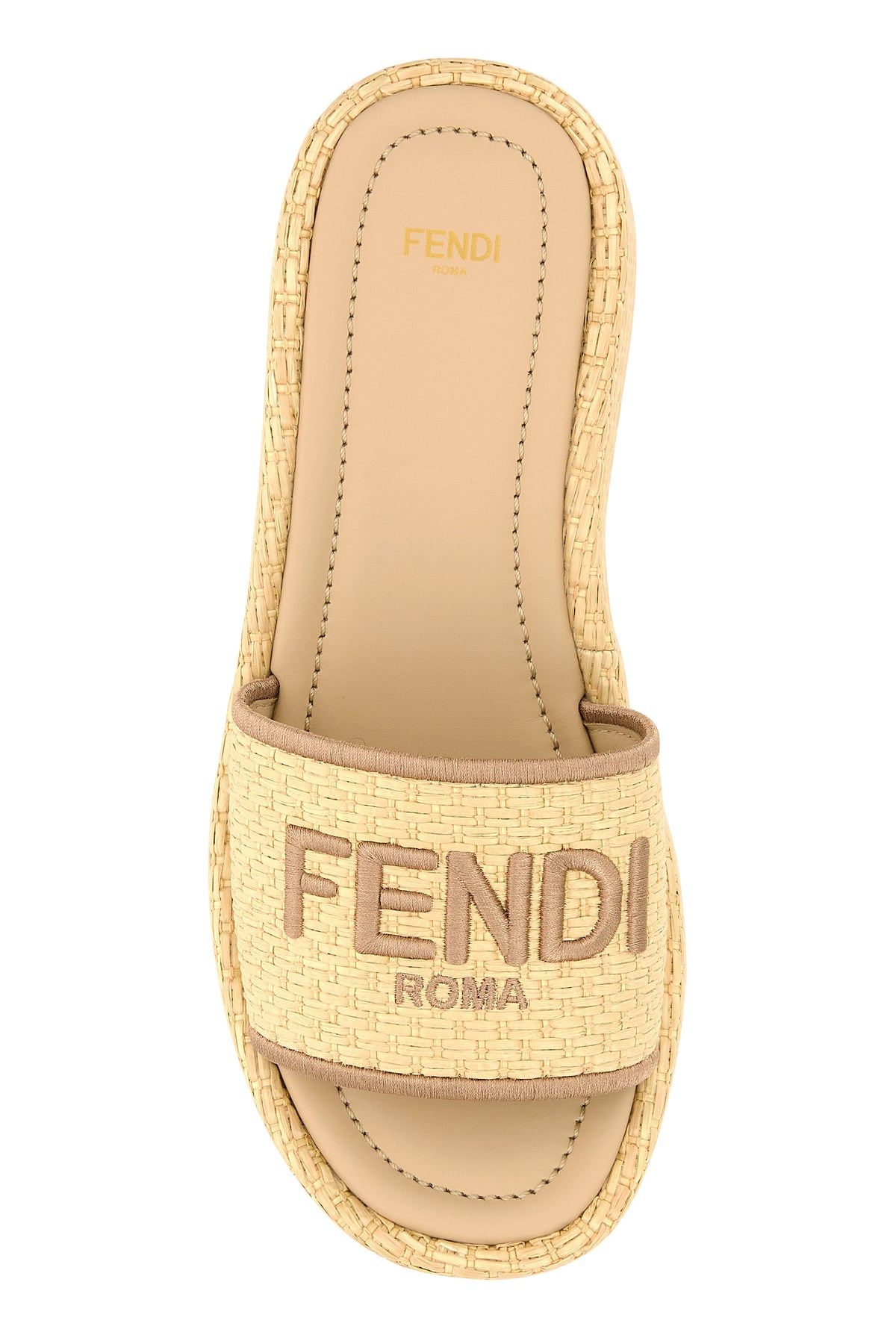 Slippers realizzate in rafia caratterizzate da ricamo Fendi Roma a contrasto sul collo del piede.