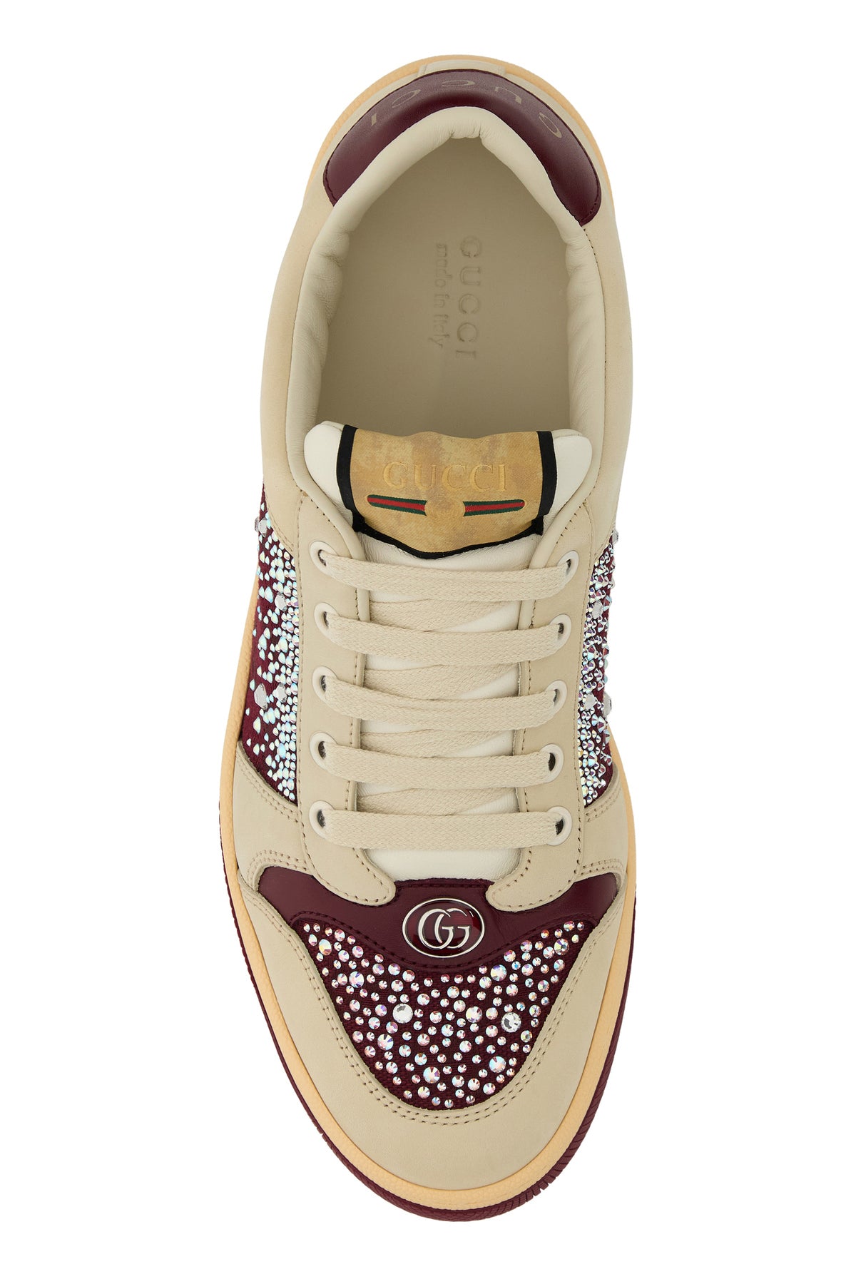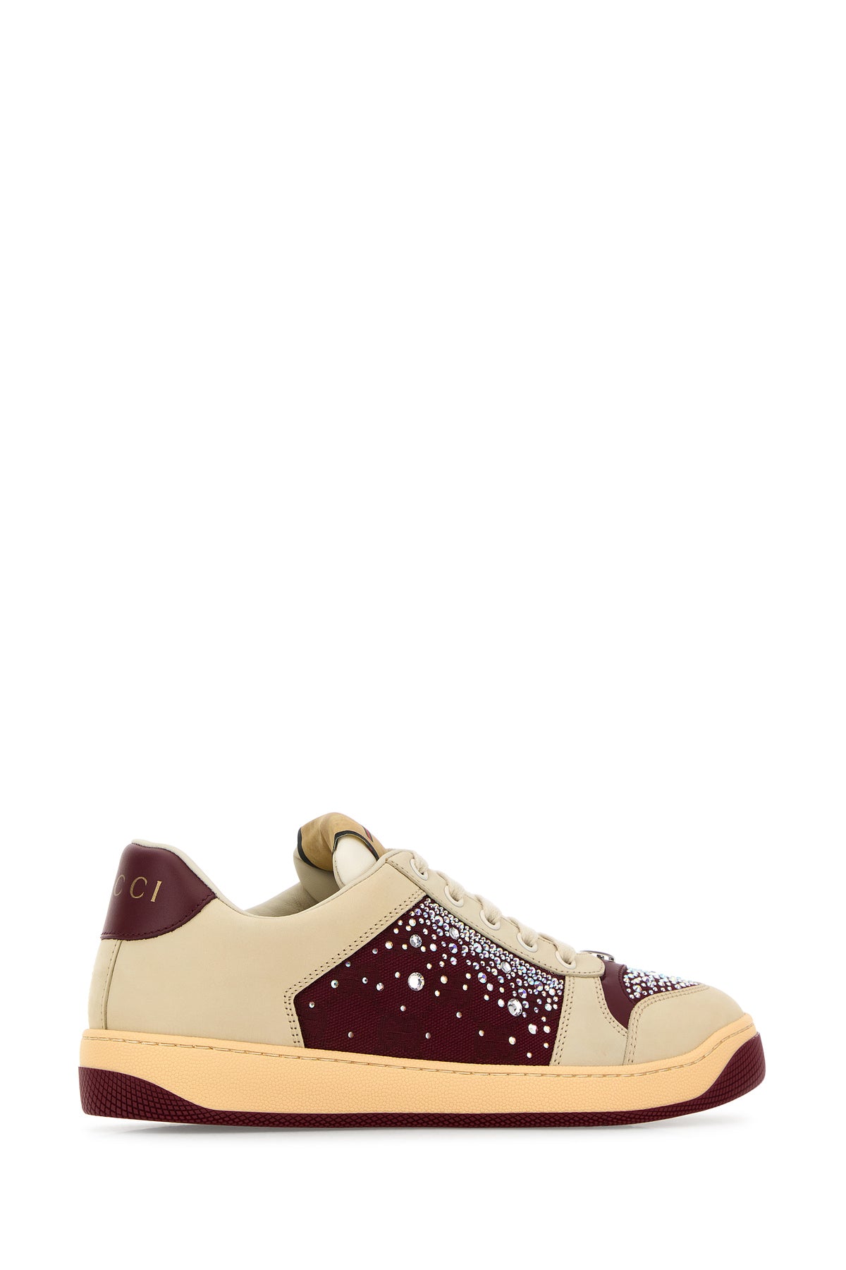 Sneakers realizzate in pelle e tessuto GG caratterizzate da logo stampato sul tallone arricchite da dettaglio metallico GG sulla punta e cristalli sulla punta e sui lati.