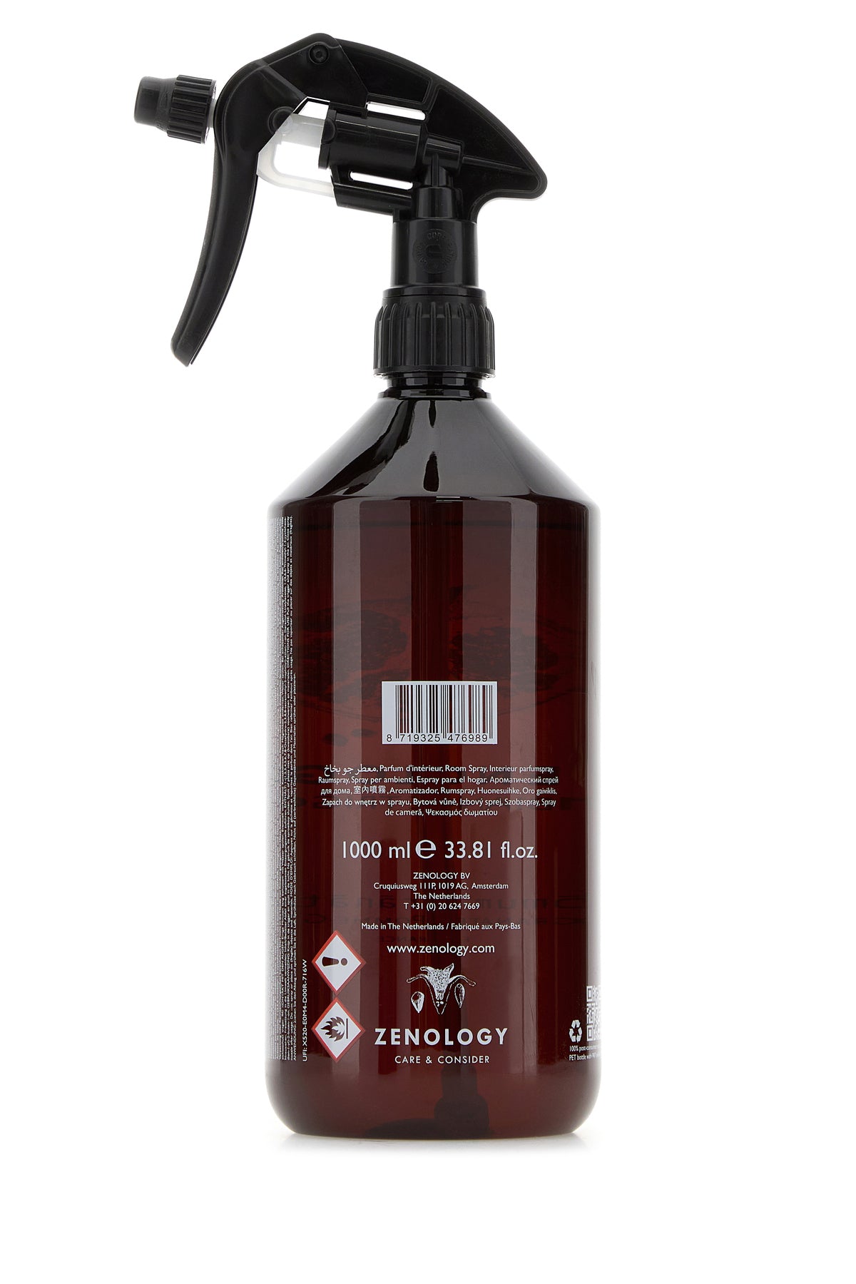 Spray per ambienti caratterizzato da flacone in PET riciclato con stampa logata sulla parte frontale.