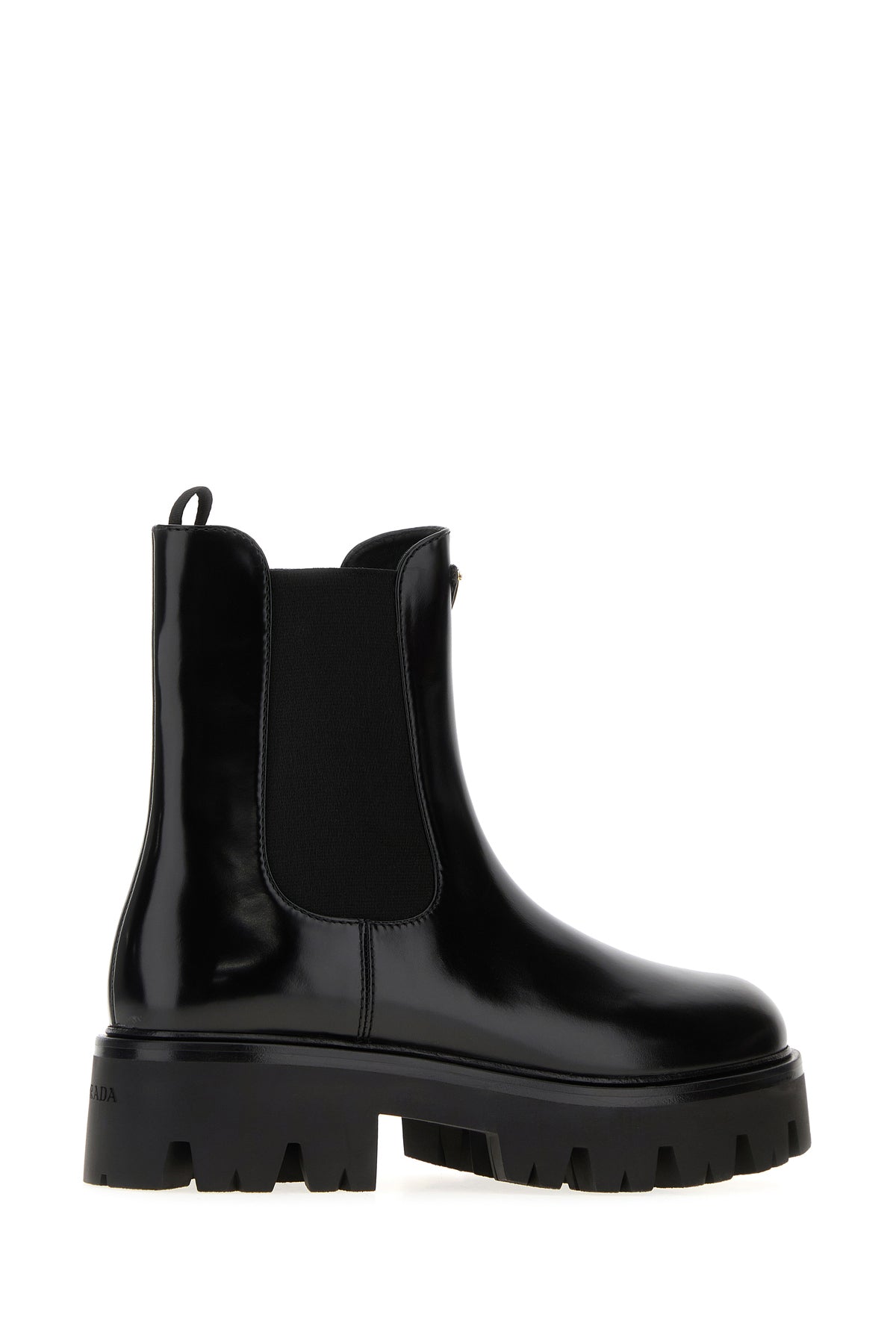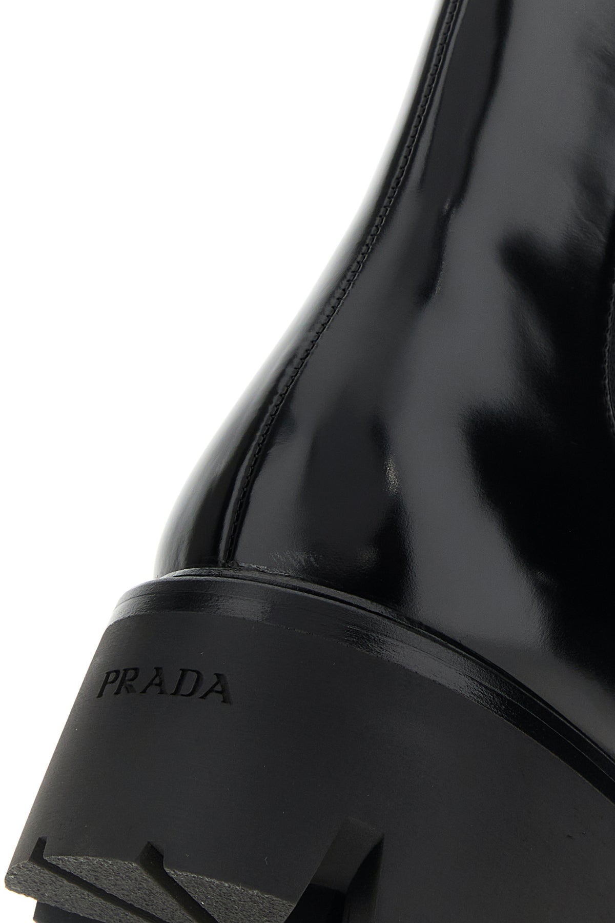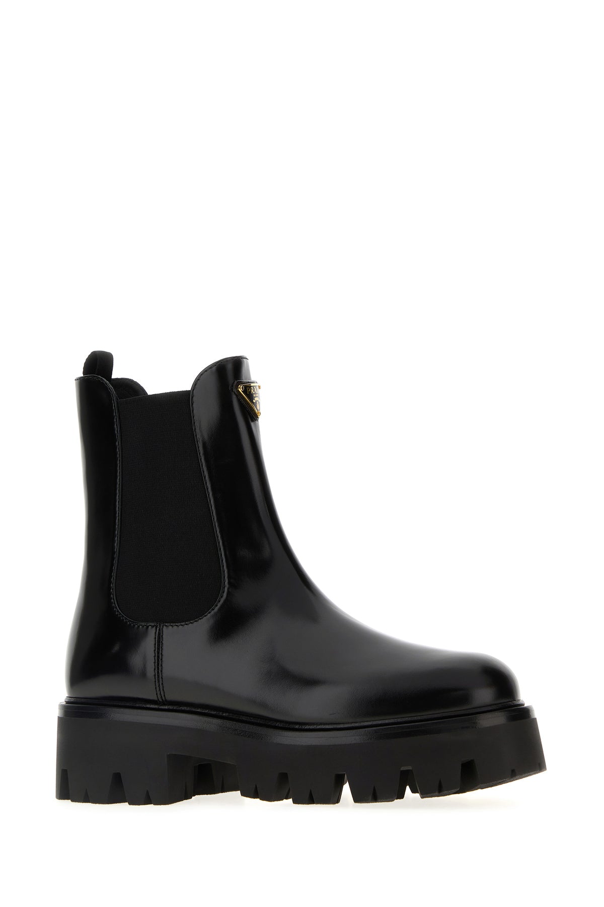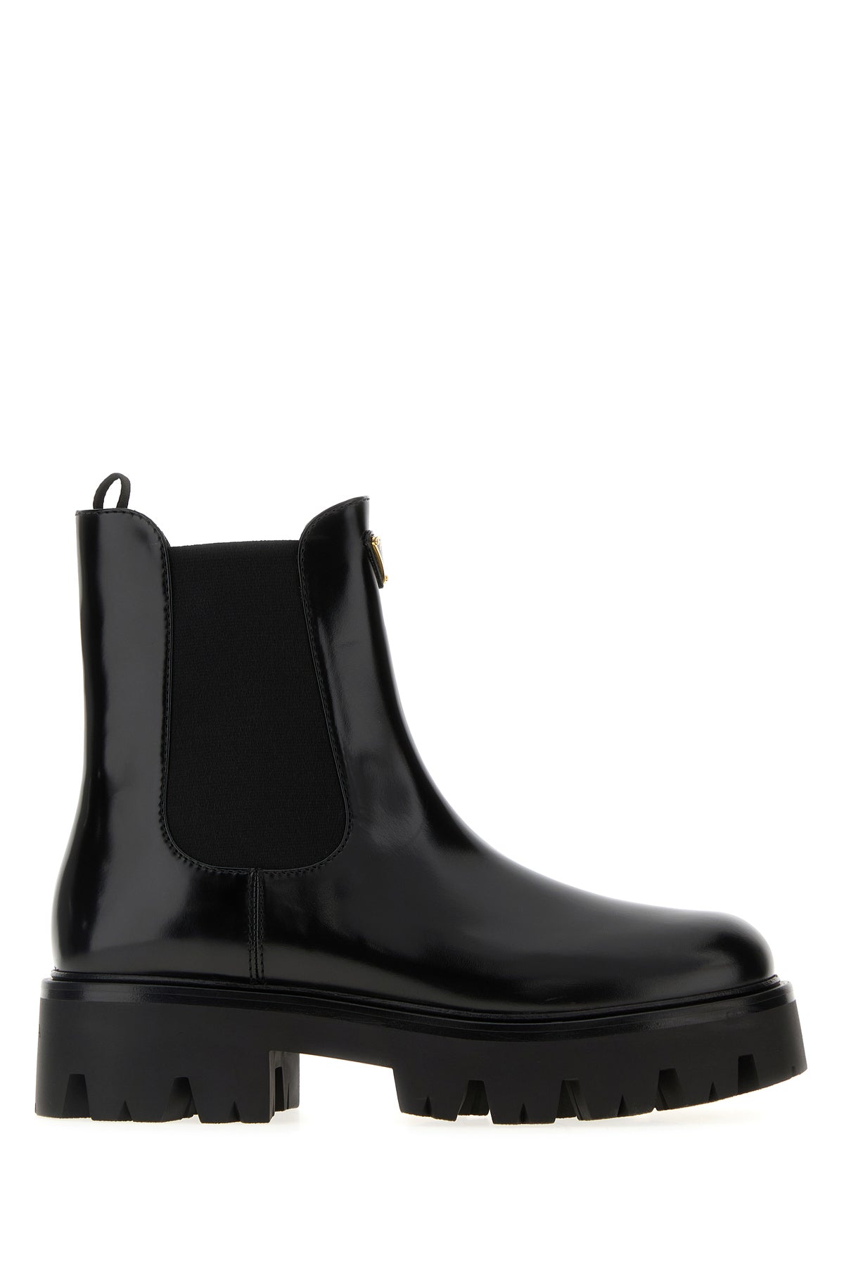 Stivaletti realizzati in pelle liscia dal finish lucido arricchiti da iconico triangolo metallico logato sulla parte frontale.