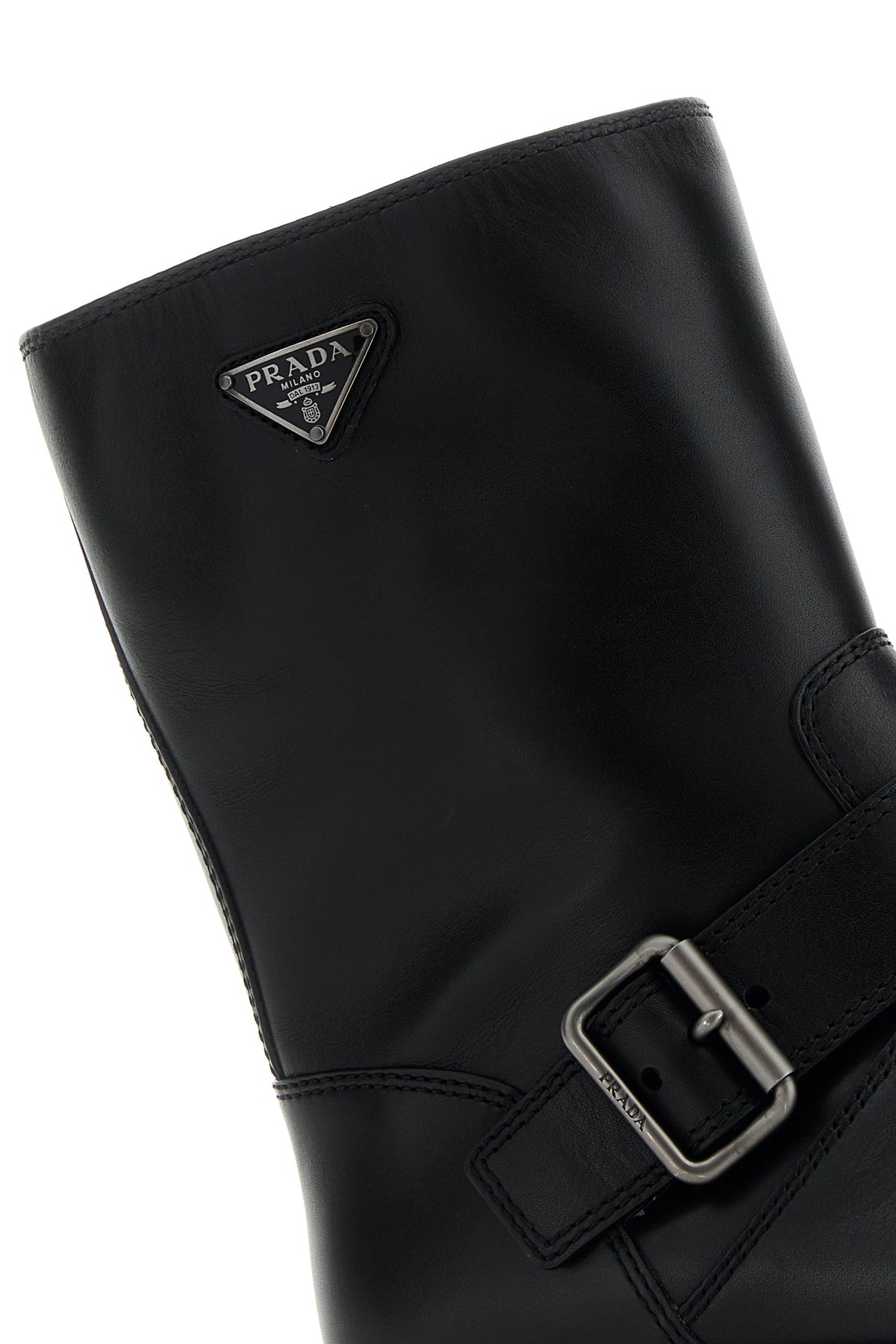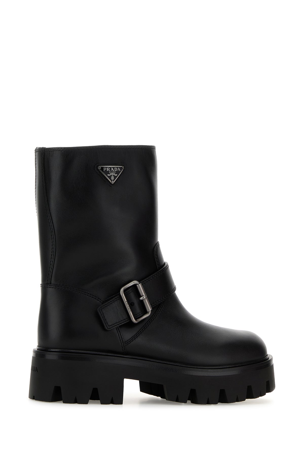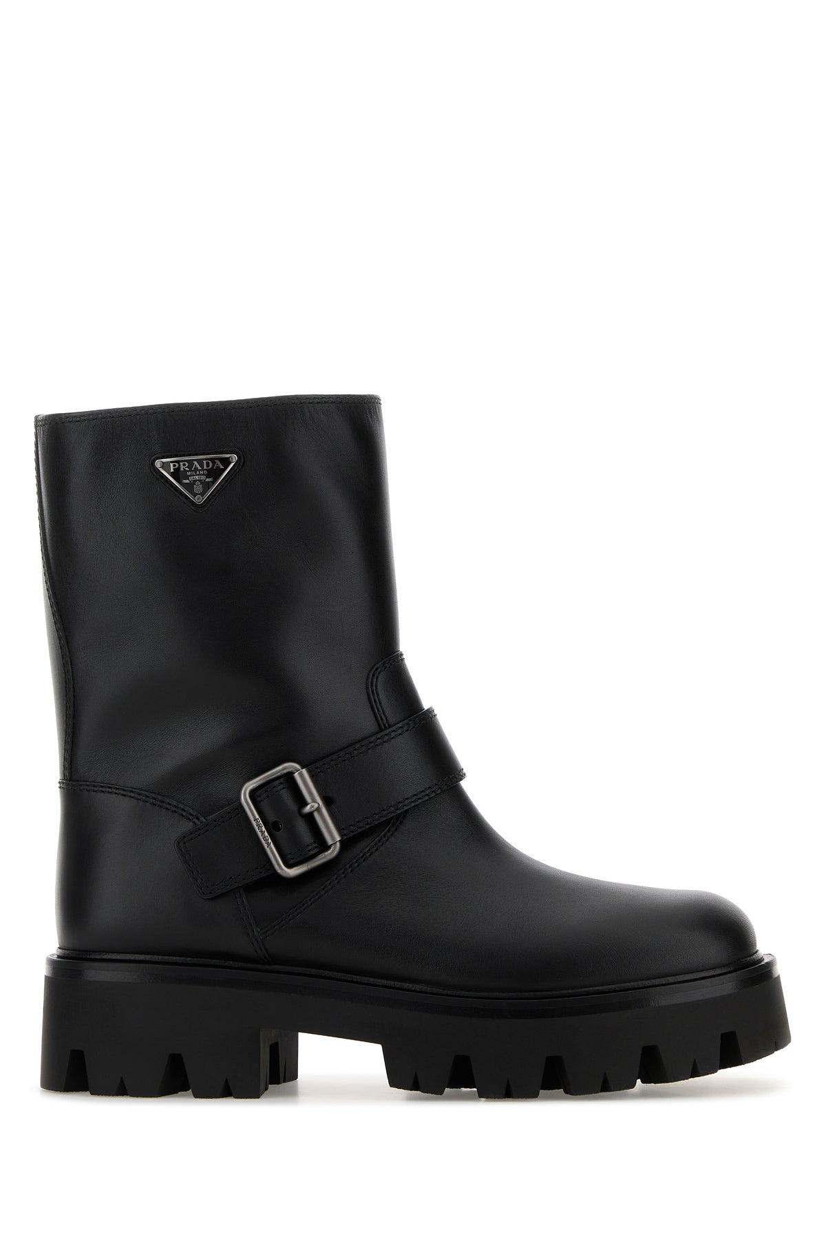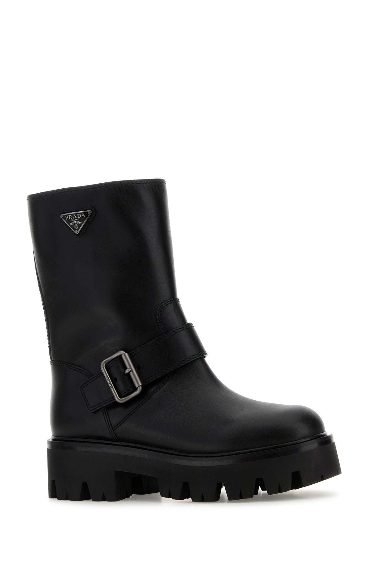 Stivaletti realizzati in pelle di vitello liscia arricchiti da iconico triangolo logato in metallo sul lato e cinturino decorativo con fibbia sulla parte frontale.