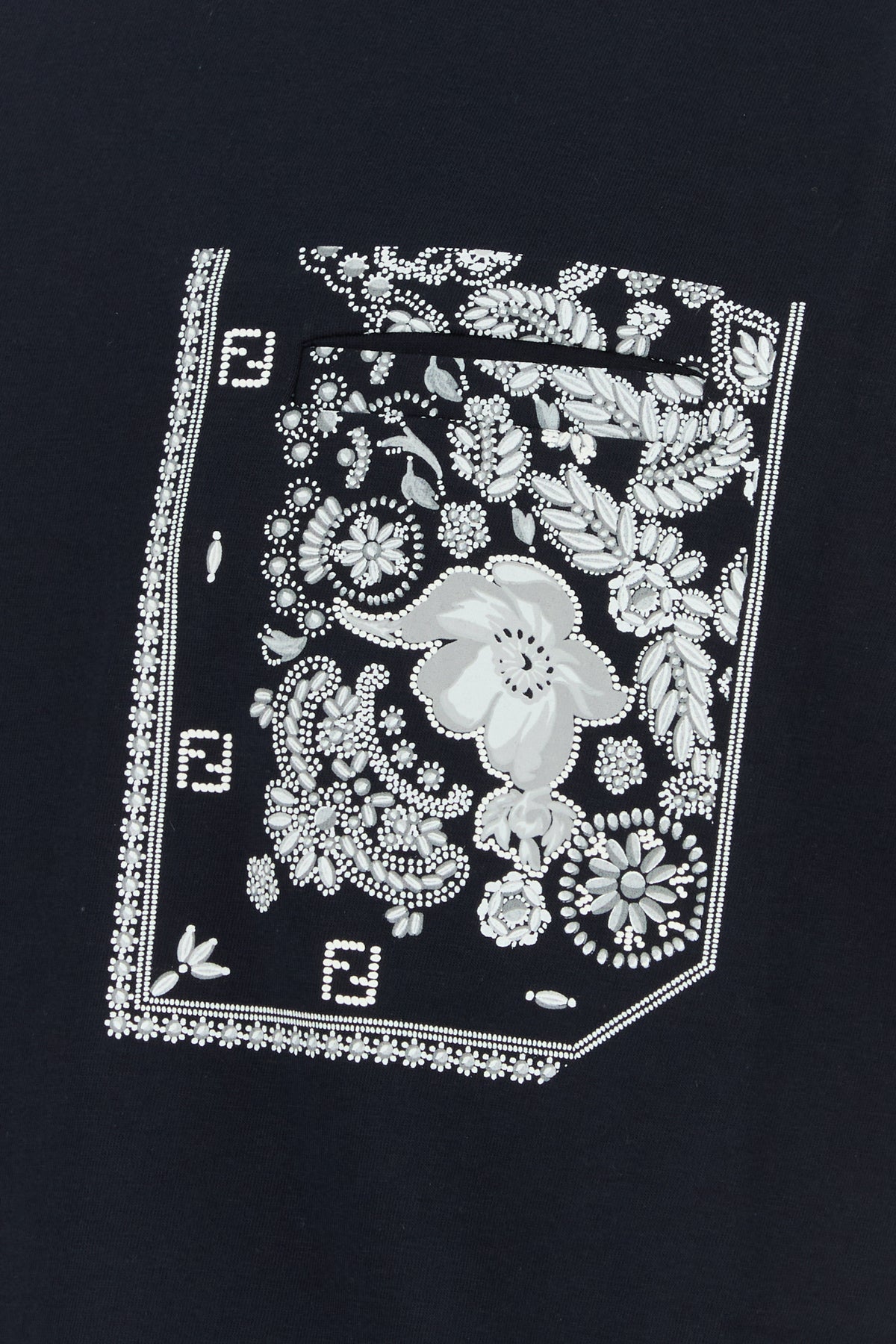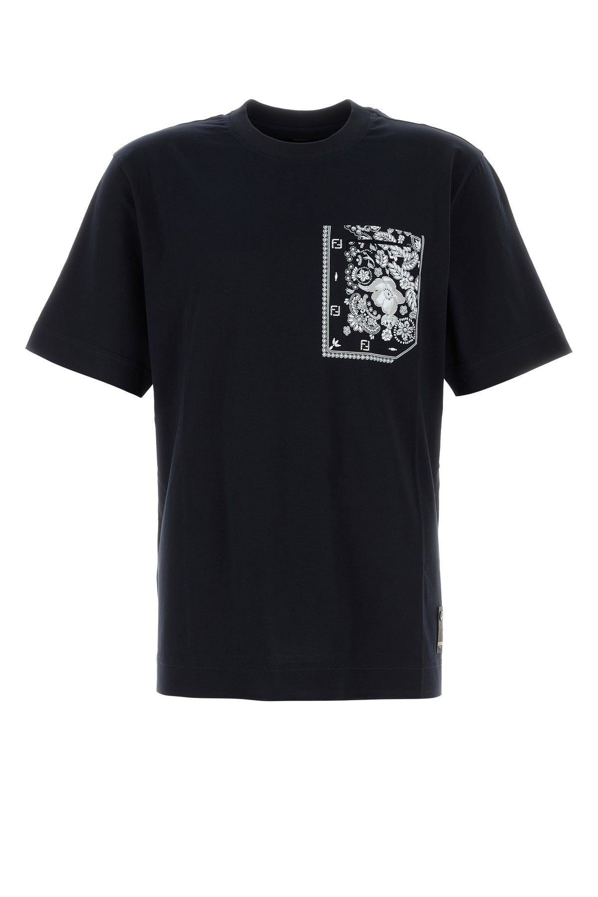 T-shirt realizzata in puro cotone caratterizzata da stampa Coral Bandana sul petto e sul retro arricchita da etichetta Fendi Roma sul fondo.
