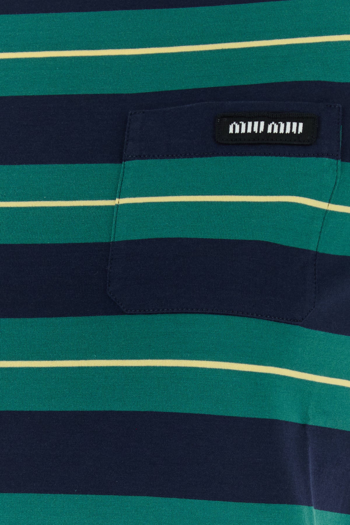 T-shirt realizzata in puro cotone caratterizzata da ricamo a righe su tutta la superficie arricchita da applicazione logata sul petto.