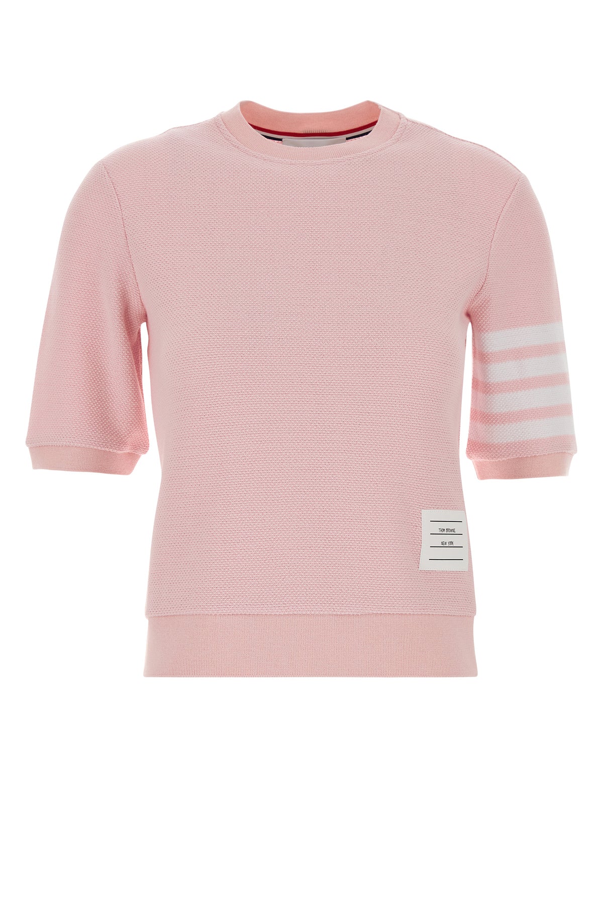 T-shirt realizzata in puro cotone caratterizzata da ricamo a righe sulla manica arricchita da applicazione logata sul fondo e iconica cucitura sul retro.