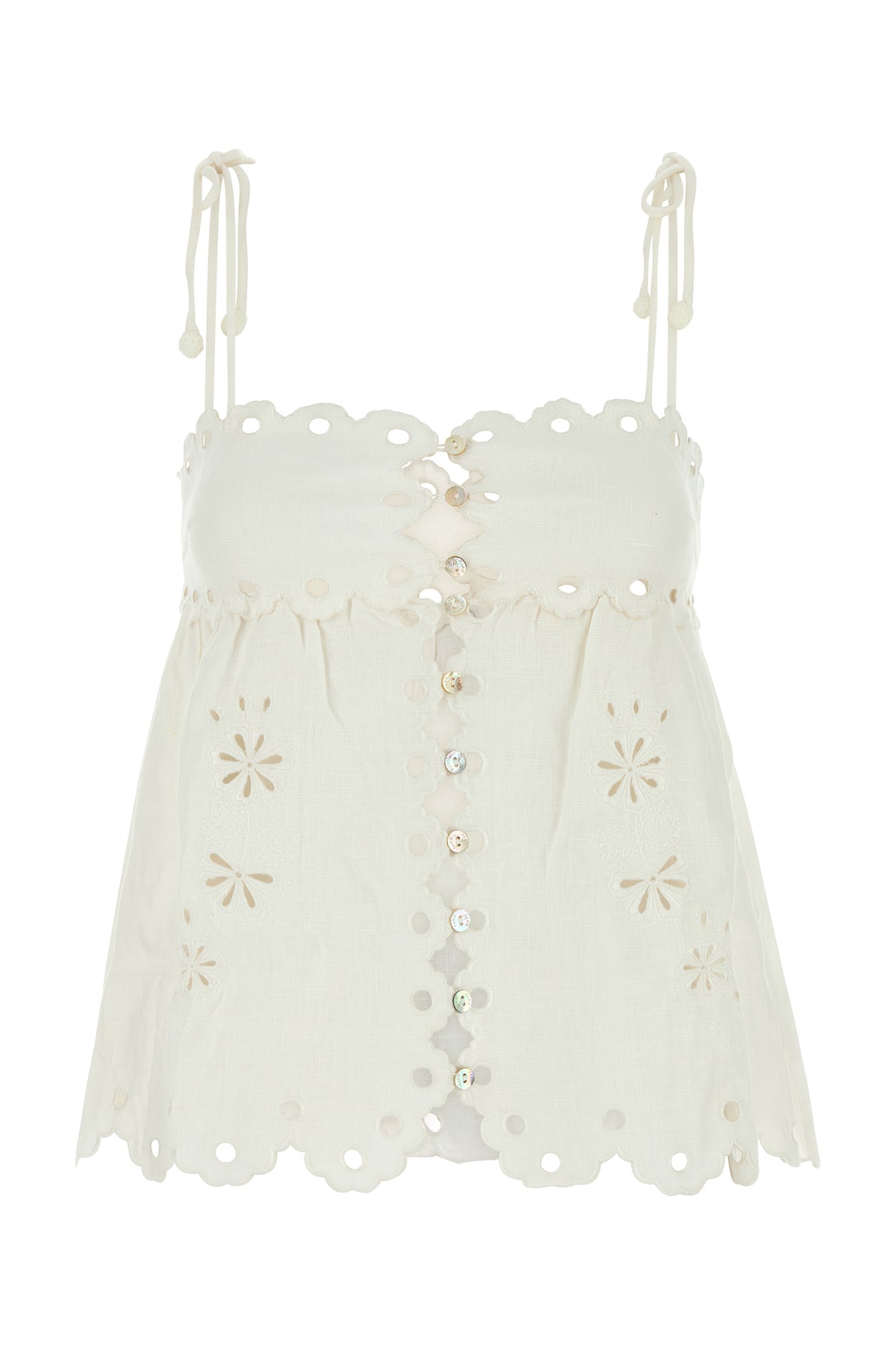 Top realizzato in puro lino caratterizzato da ricami floreali sulla parte frontale.