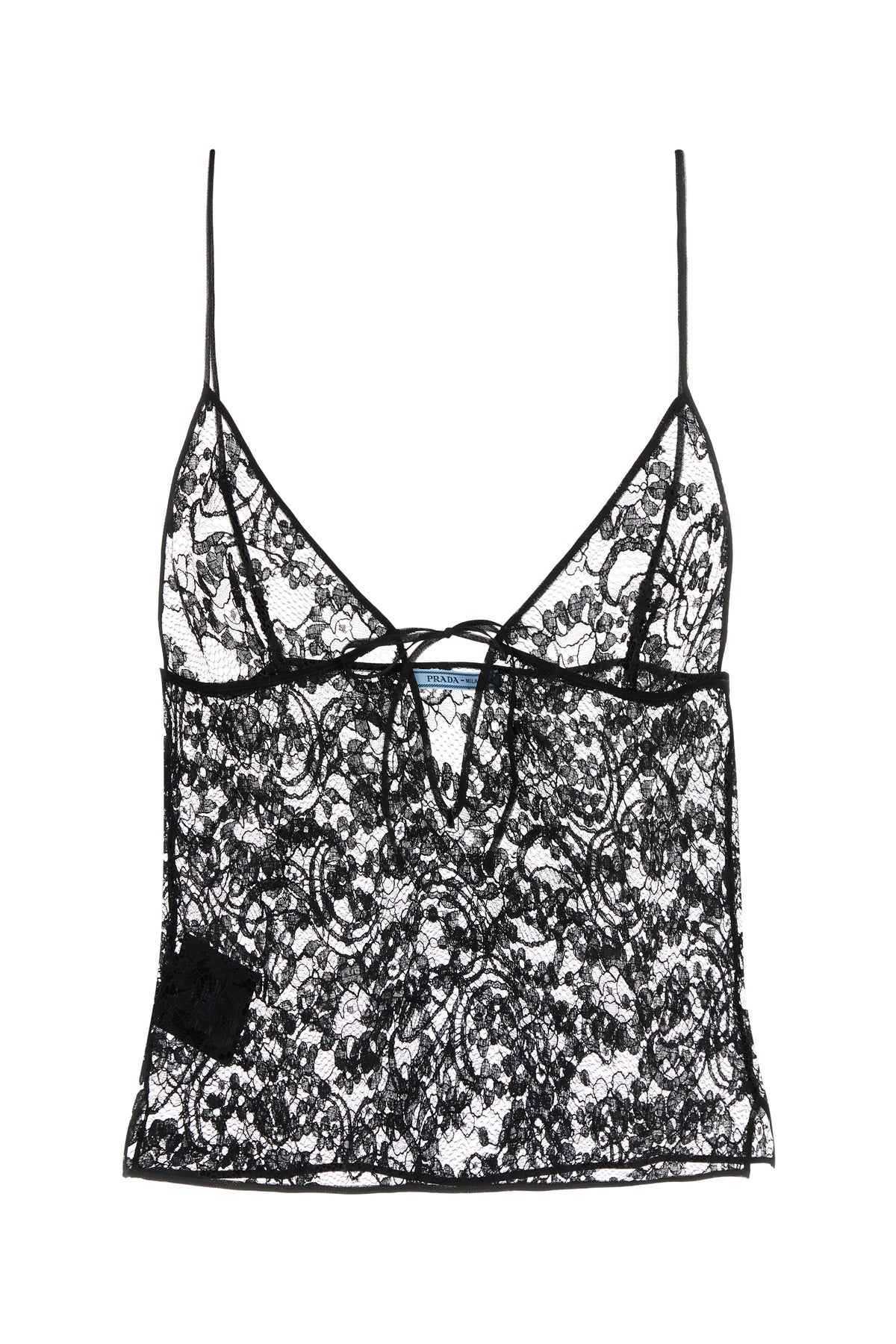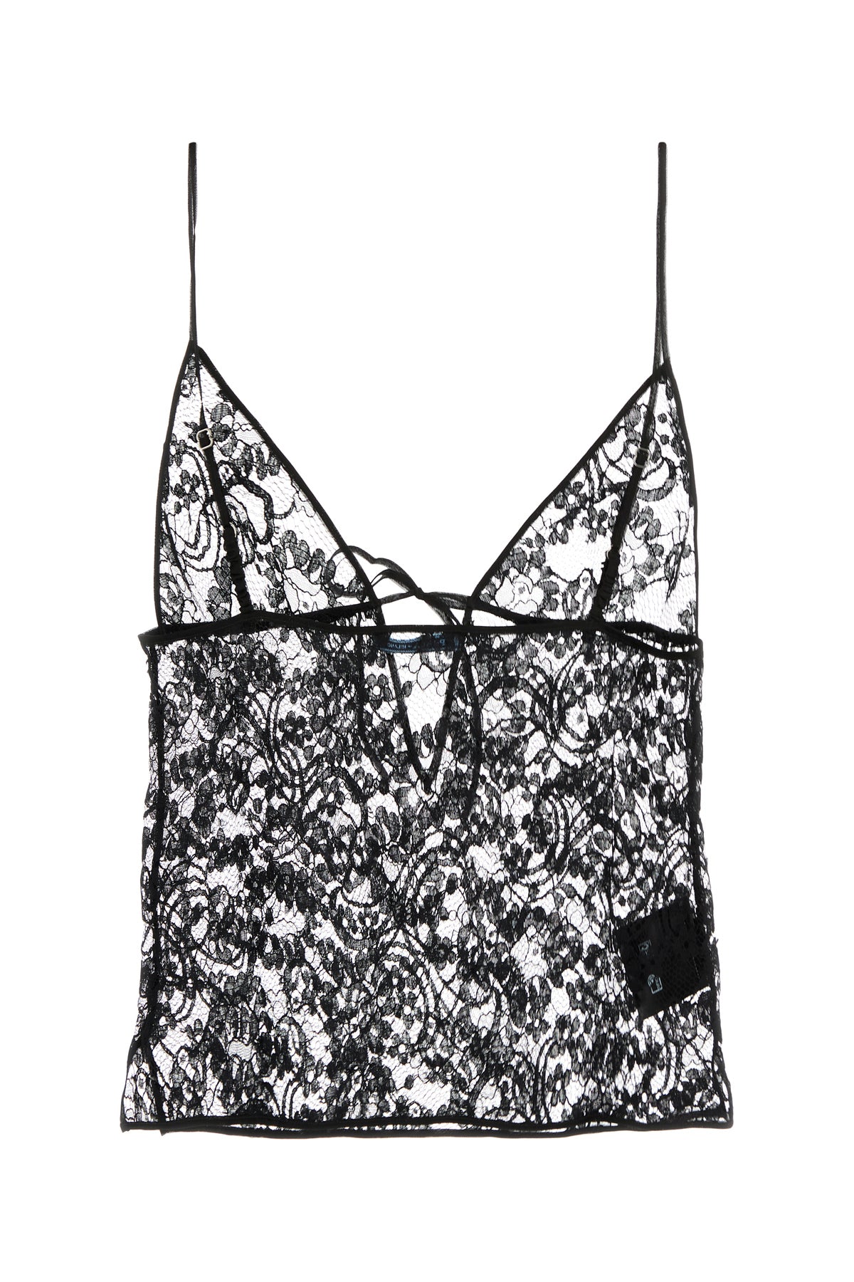 Top realizzato in pizzo caratterizzato da lacci da annodare sulla scollatura a V.