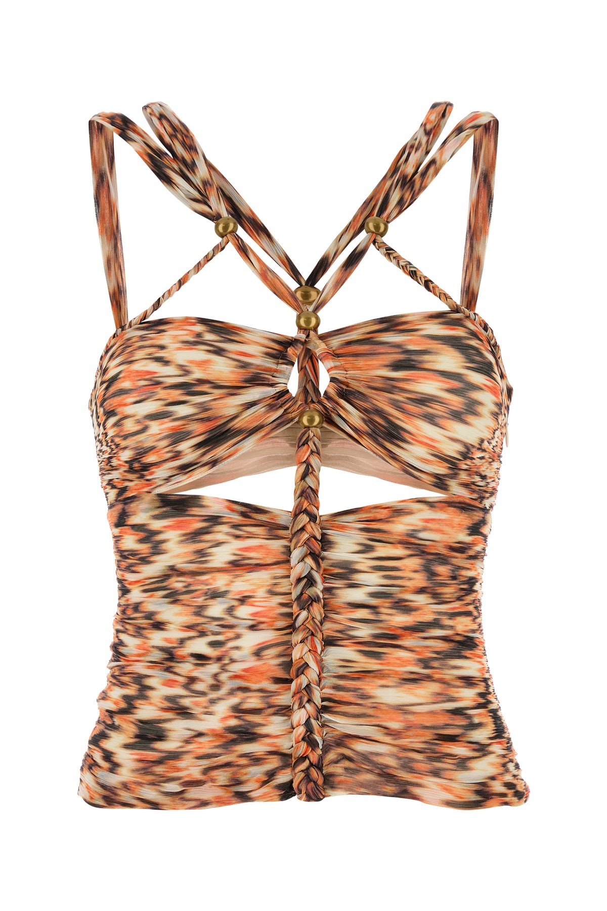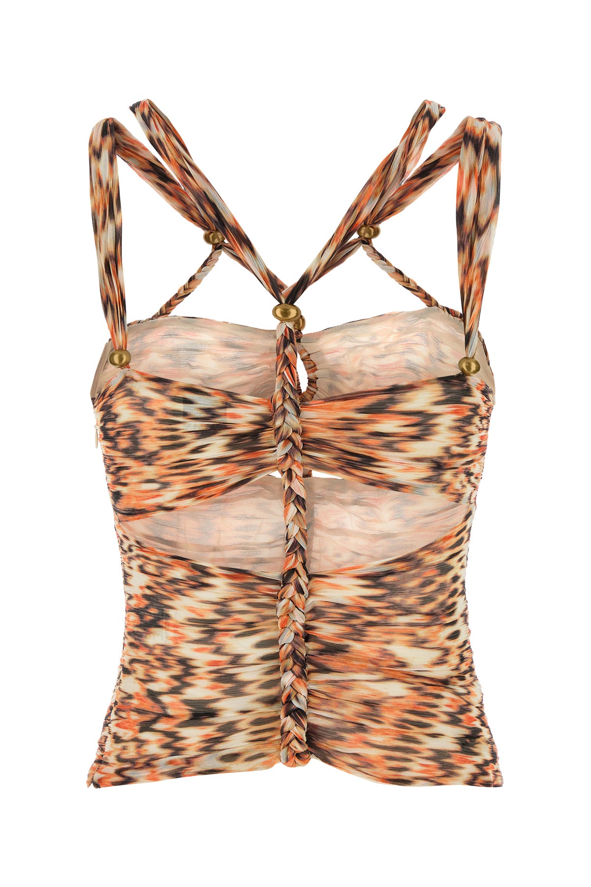 Top realizzato in pura seta caratterizzato da particolare stampa su tutta la superficie.