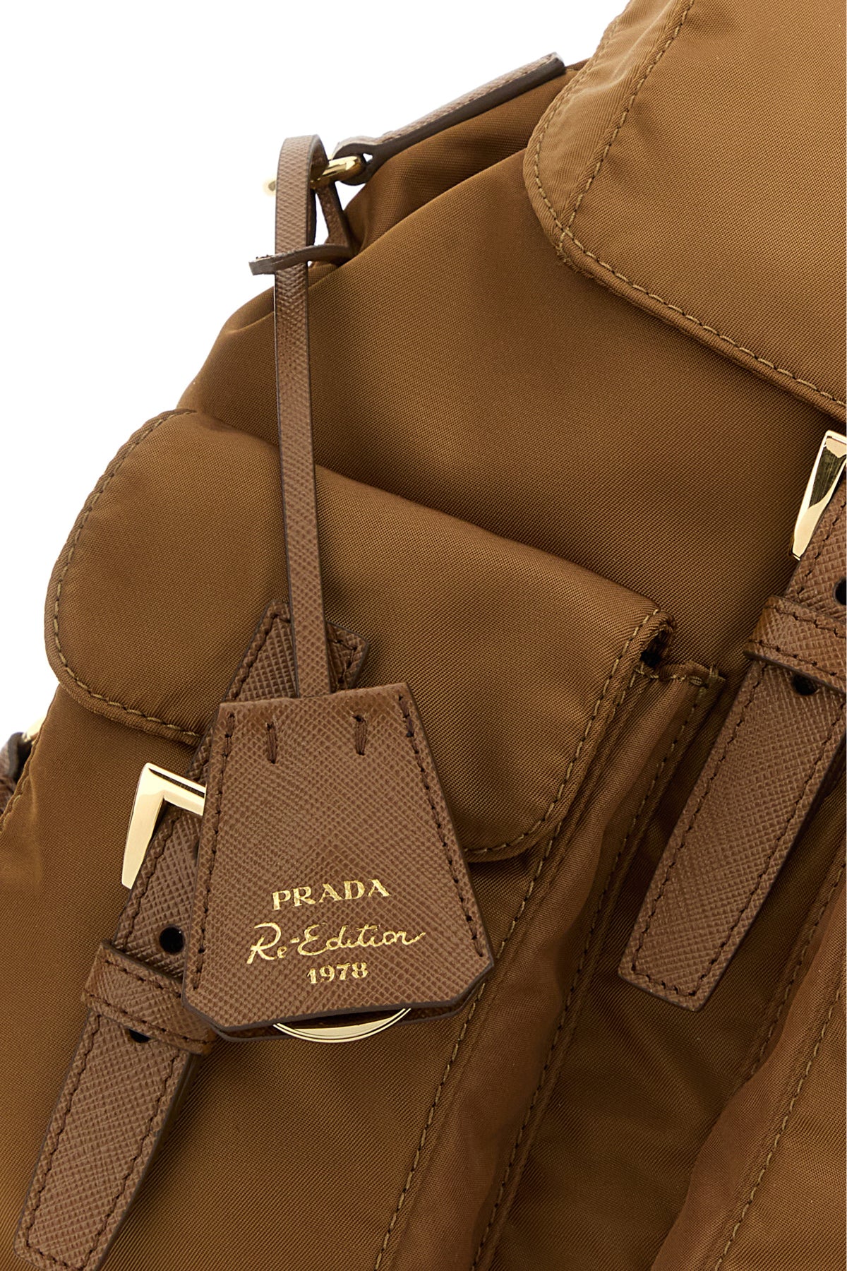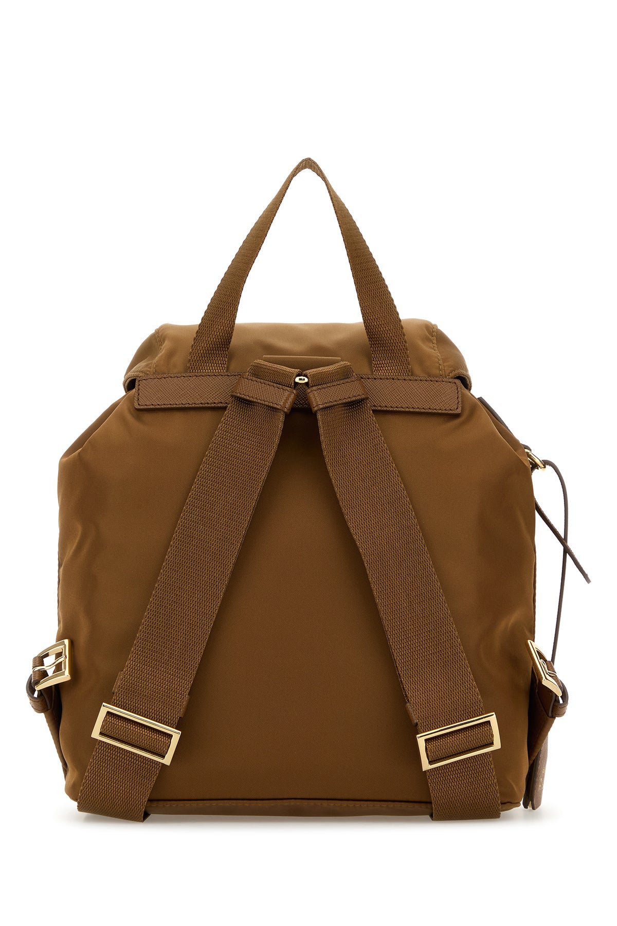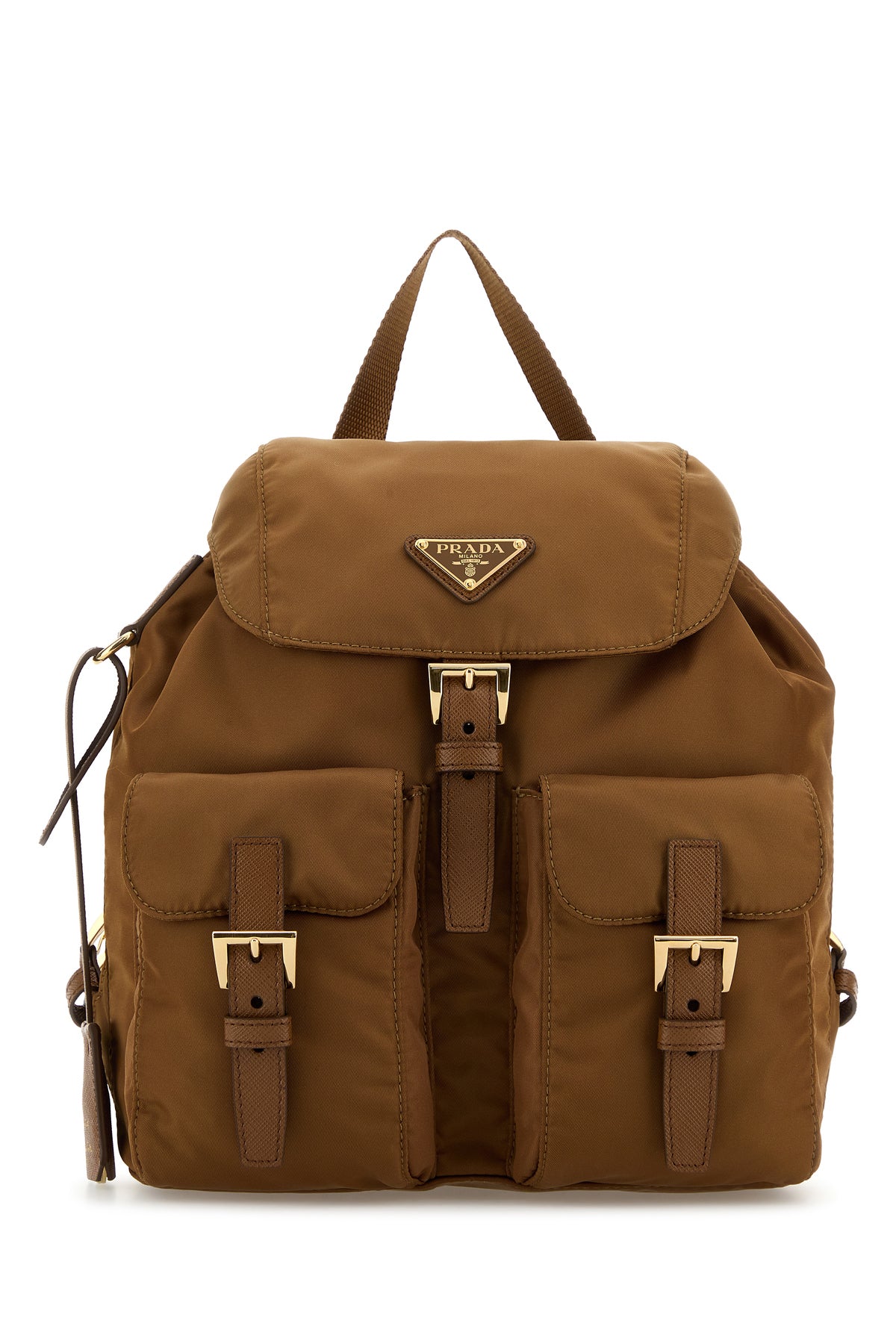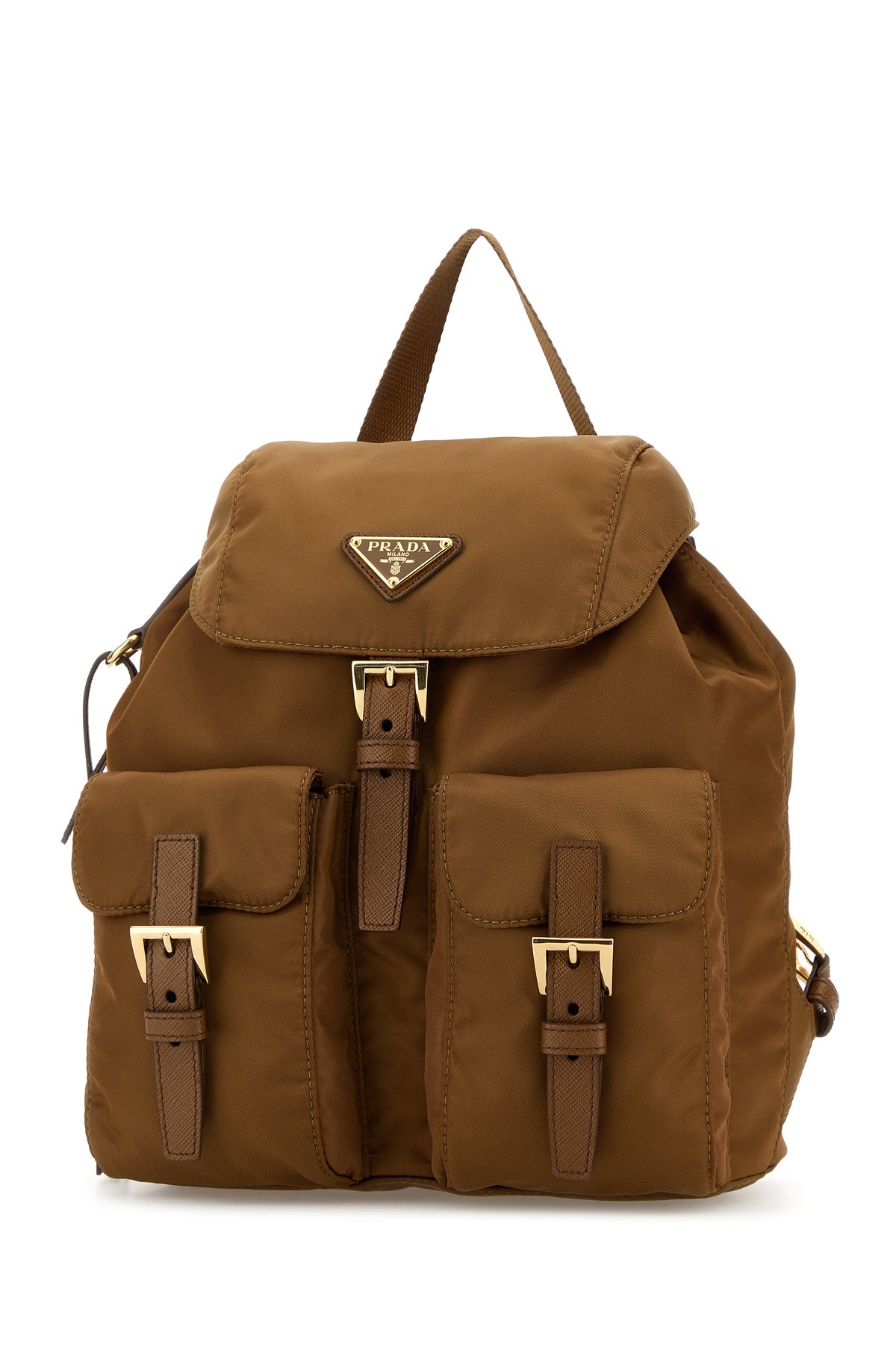 Zaino realizzato in nylon arricchito da iconico triangolo logato in metallo sulla parte frontale.
