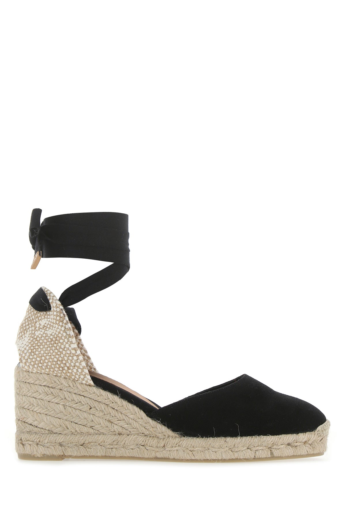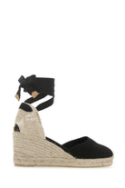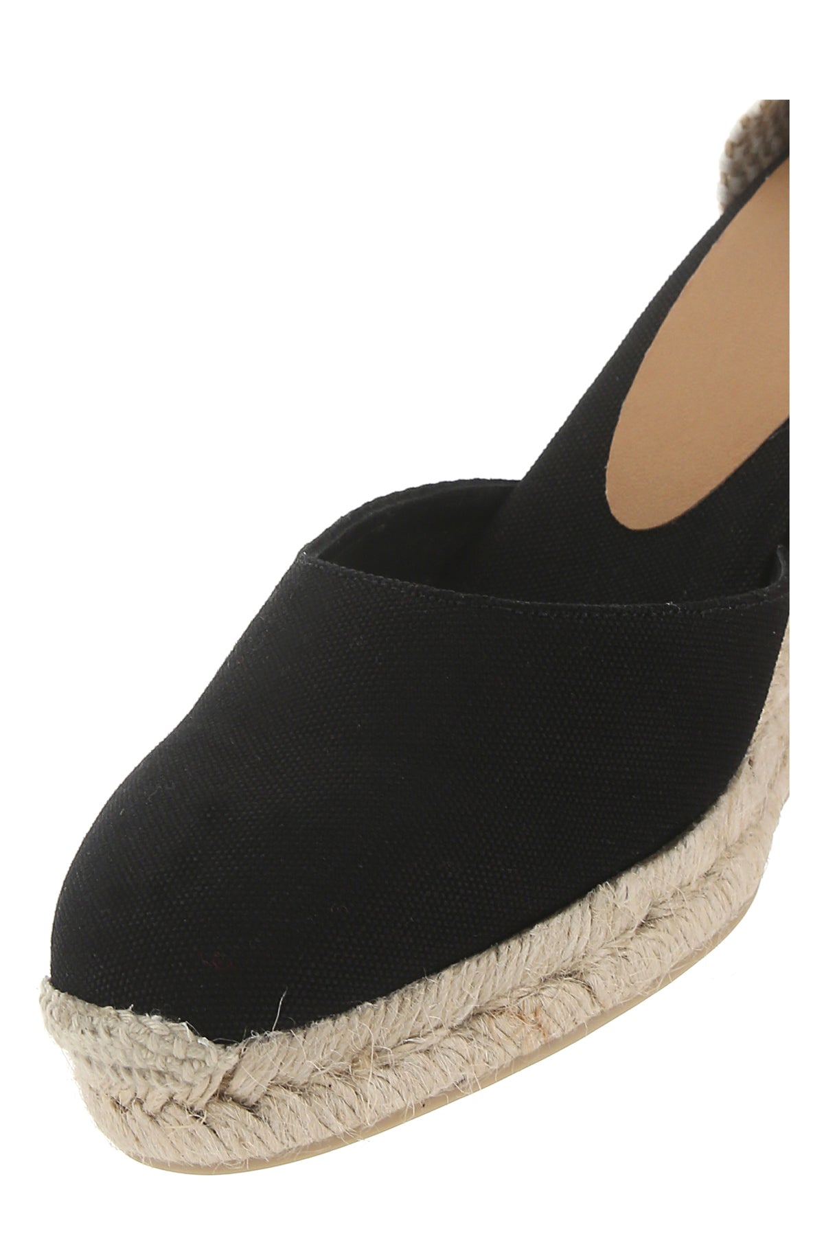 Zeppe realizzate in tela di puro cotone con inserto intrecciato sul tallone.